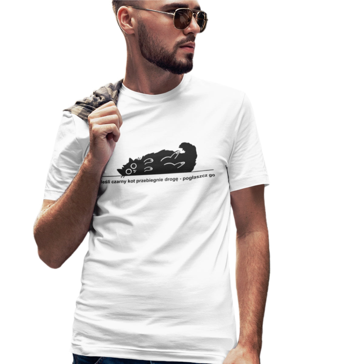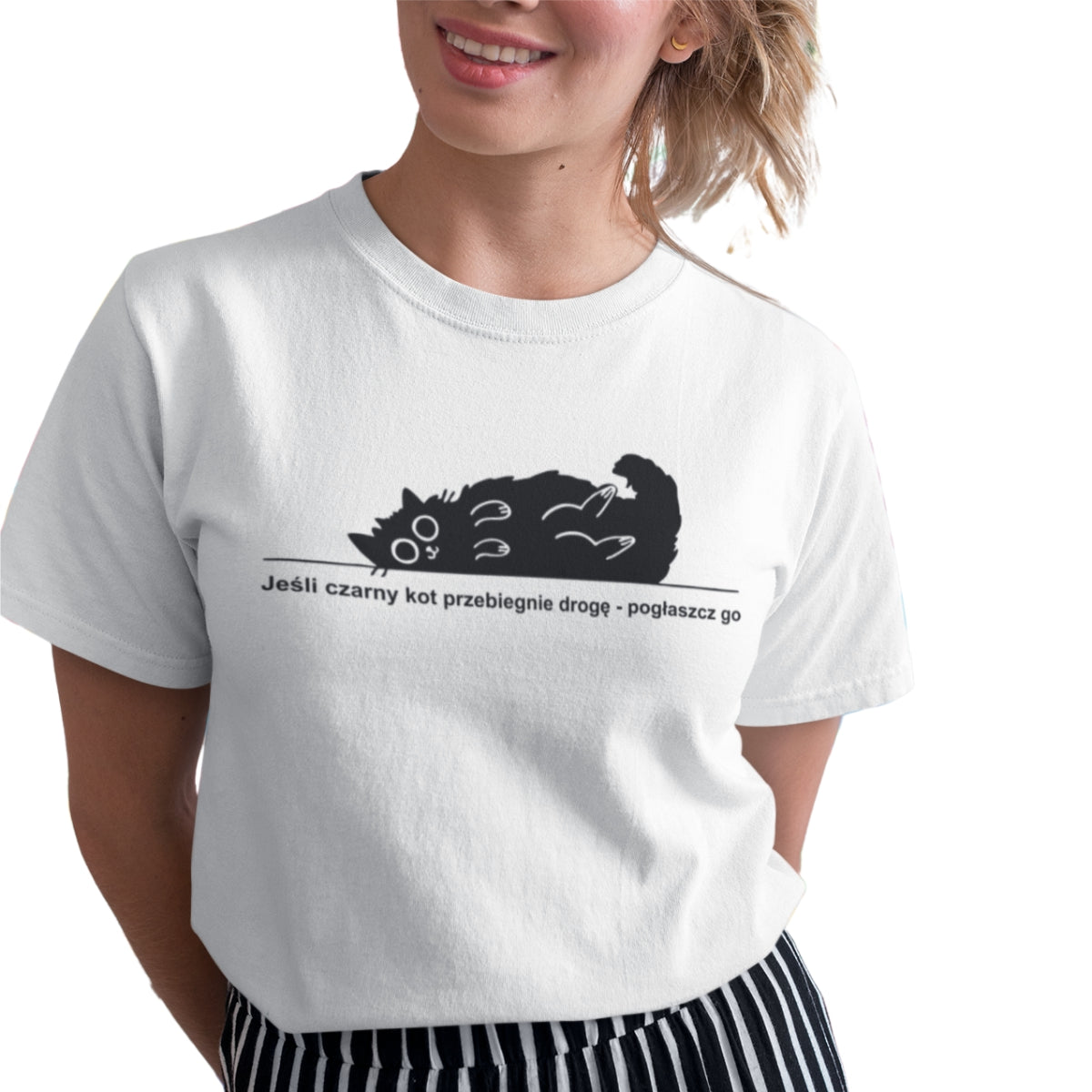 Biała UNISEX koszulka Jeśli czarny kot przebiegnie drogę - pogłaszcz go