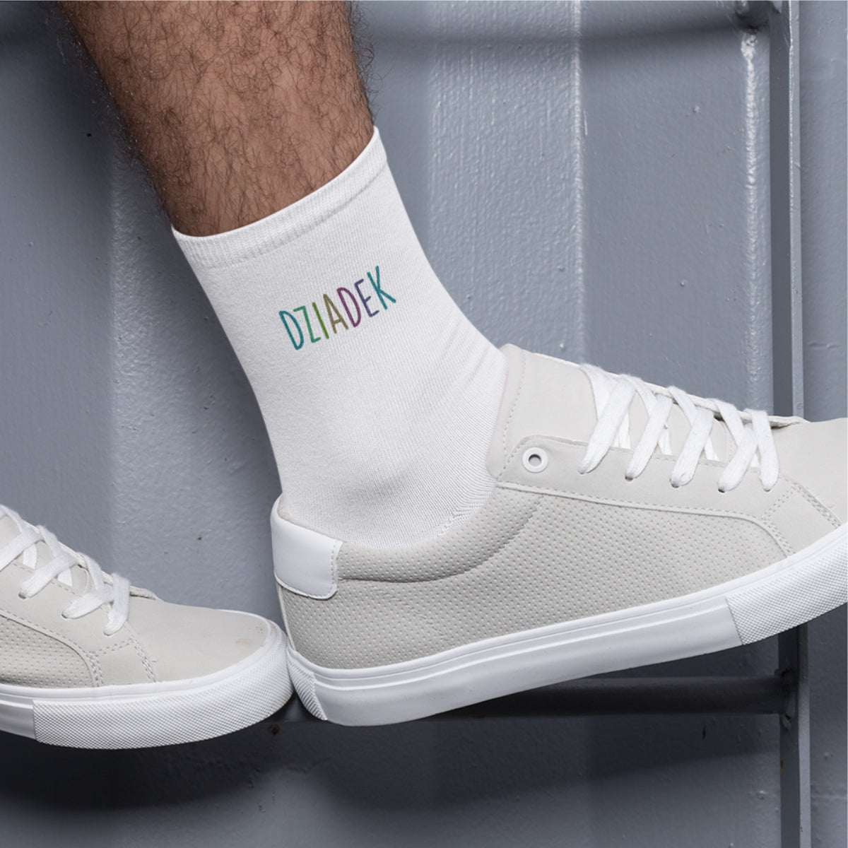 Białe skarpetki z napisami Dziadek z kolorami. Zapakowane w stylowe pudełko z okienkiem.