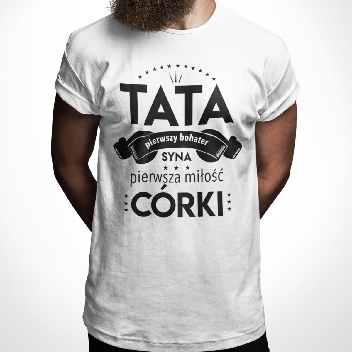 Biała UNISEX koszulka Tata, pierwszy bohater syna, pierwsza miłość córki