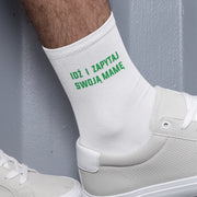 Białe skarpetki z napisami Idź i zapytaj. Zapakowane w stylowe brązowe pudełko.