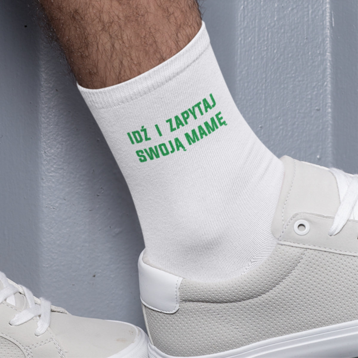 Białe skarpetki z napisami Idź i zapytaj. Zapakowane w stylowe pudełko z okienkiem.