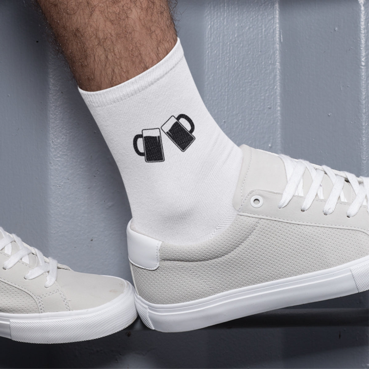 Białe skarpetki z napisami Kielichy. Zapakowane w stylowe pudełko z okienkiem.