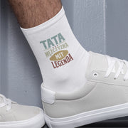 Białe skarpetki z napisami Tata to mit. Zapakowane w stylowe brązowe pudełko.
