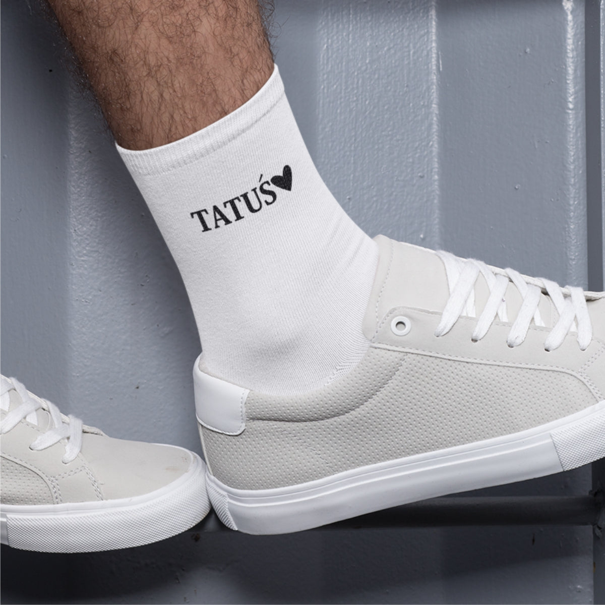 Białe skarpetki z napisami "Tatuś z sercem". Zapakowane w stylowe pudełko z okienkiem.