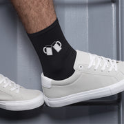 Czarne skarpetki z napisami Kielichy. Zapakowane w stylowe brązowe pudełko.