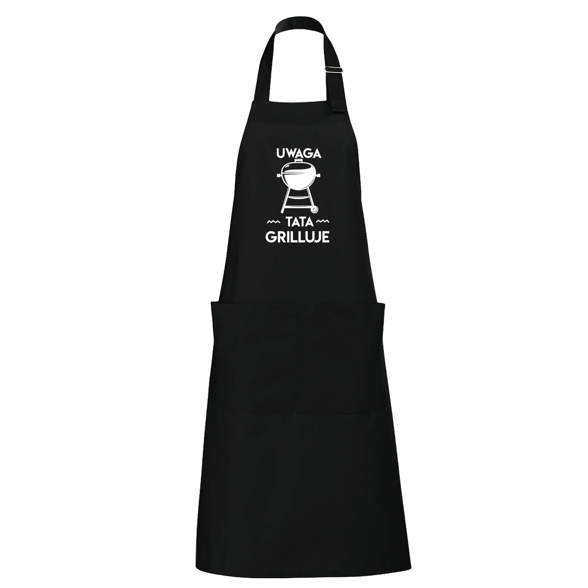 Czarny długi fartuch z kieszeniami - Uwaga Tata grilluje