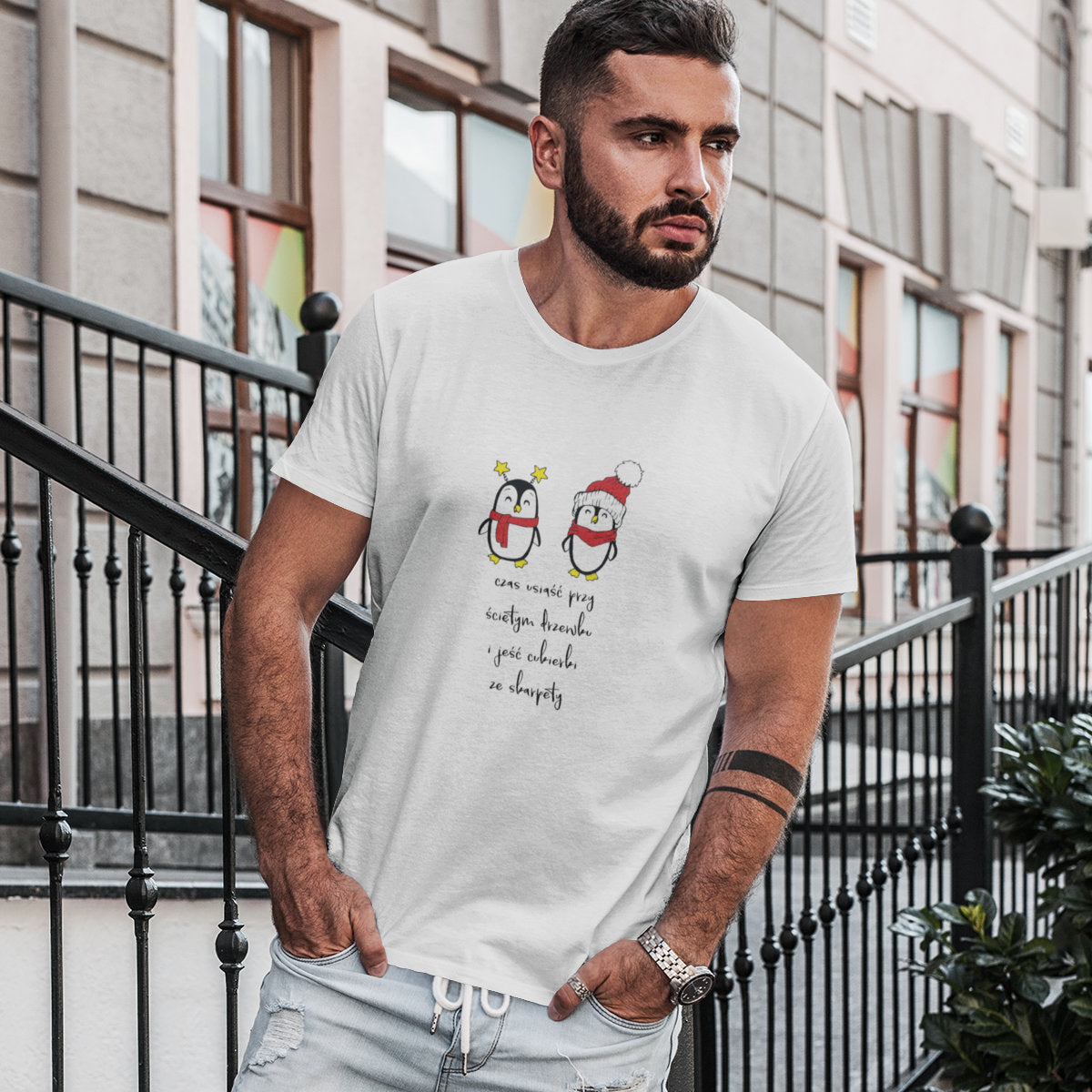 Biały UNISEX T-shirt Czas usiąść przy ściętym drzewku