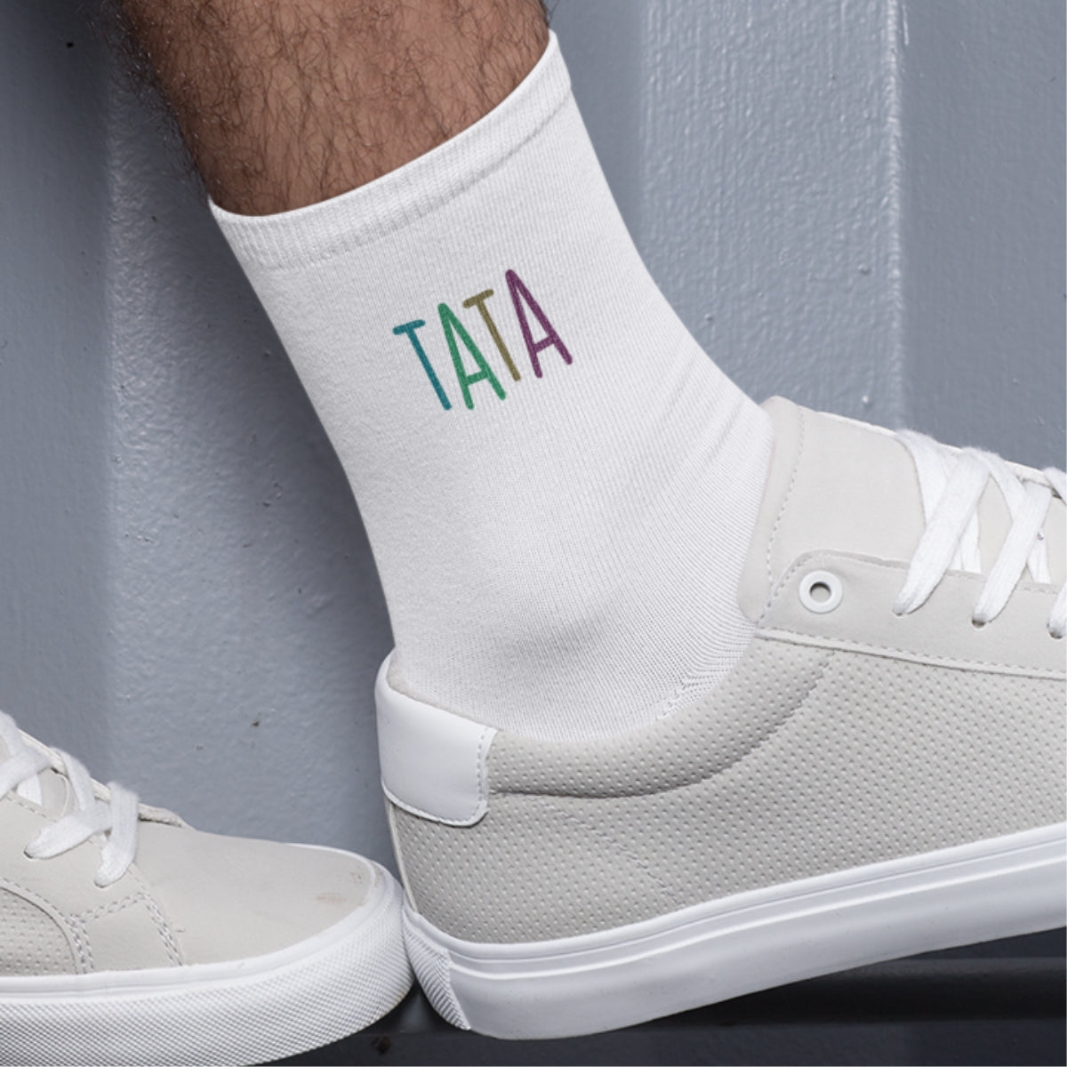 Białe skarpetki z napisami Tata z kolorami. Zapakowane w stylowe pudełko z okienkiem.