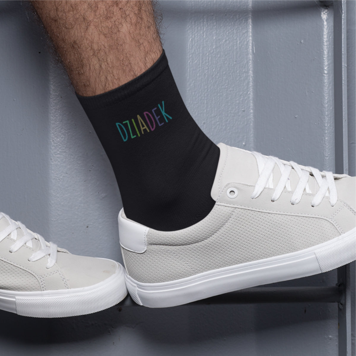 Czarne skarpetki z napisami Dziadek z kolorami. Zapakowane w stylowe brązowe pudełko.